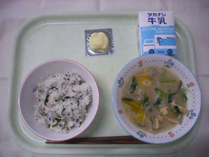 【給食・7月28日】 公開日 2020/07/28 更新日 2020/07/28 学校日記 〔献立〕 ・わかめとしらすのごはん ・かぼちゃの味噌汁 ・個包装チーズ ・牛乳 夏野菜の一つであるかぼちゃの入ったみそ汁です。 この時期ならではの汁ものです。 給食
