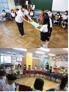 今日は、各クラスで学期末のお楽しみ会をしました。どのクラス木計画から話し合いみんなが楽しめる遊びを考え、おおいに盛り上がりました。そして、最後には指導補助の先生に「ありがとう」を伝えました。1学期の間、いろいろな場面で助けてもらい、声をかけてくれた先生に、感謝の気持ちを届けることができました。