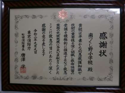 9月9日救急の日に町田消防署長から感謝状をいただきました。「救命講習の受講を積極的に推進するなど救急業務の充実発展に多大な貢献をした。」と言うことです。教職員が救命講習を受講するのは当たり前のことですが、南つくし野小では5年生が町田消防署の方をお招きして救命講習を行っています。そのことを認めていただいたのかもしれません。今年度は消防署より、見合わせの連絡がきており、実施は難しいと思われます。関連した活動を考え実施できればと思います。