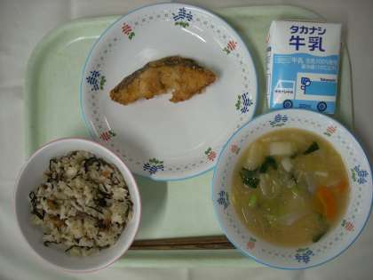 【給食・11月12日】 公開日 2020/11/13 更新日 2020/11/13 学校日記 〔11月12日の献立〕 ・ひじきごはん ・ホキの竜田揚げ ・みそ汁 ・牛乳 「ひじきごはんをまた出してほしい」「ホキの竜田揚げがおいしかった」 といったような感想をいただきました。 全体的によく食べていました。 給食