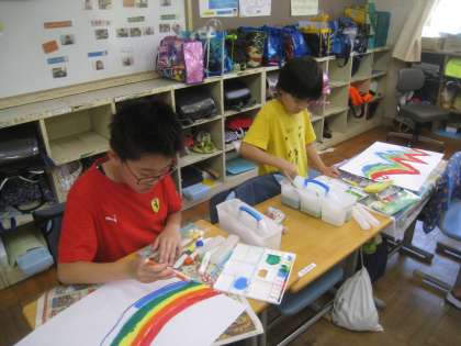 図工では、「にじをかこう」の活動がすすんでいます。