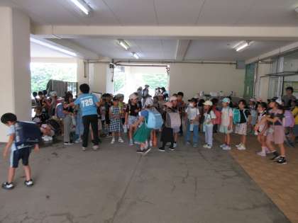 今月の避難訓練は、これから大雨になる予報が出て、速やかに下校するという想定で訓練を行いました。学年ごとに、ピロティで方面別に人数確認をして帰りました。本校の入り口が3方向あることもあり、大きな混乱もなく速やかに下校することができました。