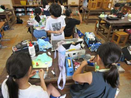 4年生の図工の様子です。自分の宝島が完成に近づいています。木工用ボンドが乾くと透明になることを利用して、池を作っていました。