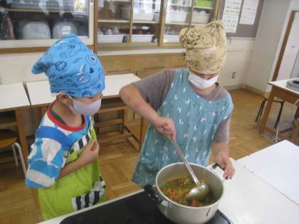 野菜を包丁で切ったり、鍋で煮たりして作ったカレーを みんなでおいしく食べました。