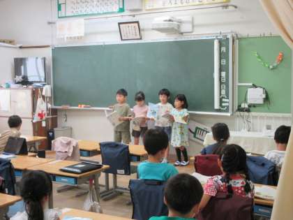 1年生の国語の学習の様子です。音読発表会を行っていました。「おむすびころりん」をグループごとに音読していました。