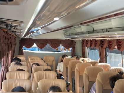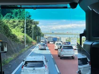 東名高速道路に乗りましたが、渋滞しています。この後、バスレクで盛り上がる予定です。