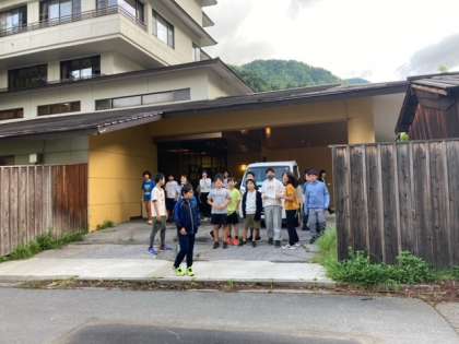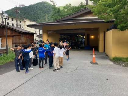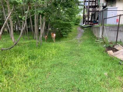 朝会のため、ホテル前に集まりました。子供の視線の先には鹿が親子でいました。