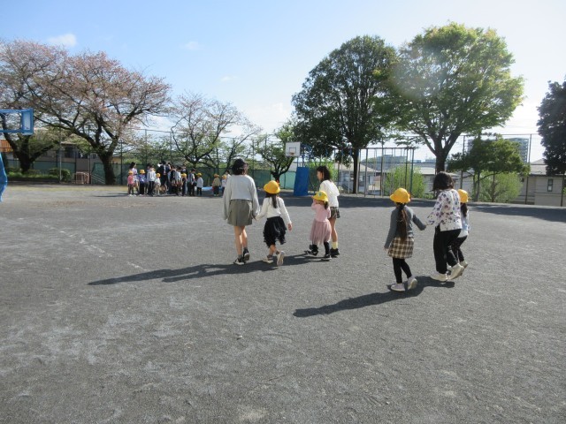 校庭で1年生を迎える会を行いました。6年生と手をつないでアーチをくぐり、整列しました。