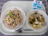 マーボー丼わかめ入りサラダ野菜スープ牛乳