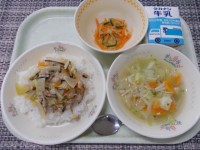 秋の香りごはんかつおの和風揚げキャベツのおひたしかきたま汁牛乳