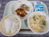 ごはん鶏肉とじゃがいもの揚げ煮からしあえ青梗菜のスープ牛乳