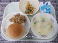丸パン中華そぼろパリパリれんこんサラダ豆乳スープ牛乳