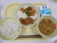 ごはんカレー肉じゃが大根ときゅうりの華風漬け豆かりんとう牛乳