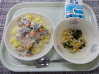 わかめごはん鶏肉の塩こうじ焼きコーンのおひたしきらきら星けんちん汁牛乳
