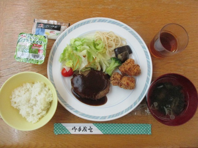 夕飯:ご飯、汁物、ハンバーグ、唐揚げ、サラダ、スパゲティ、マスカットゼリー