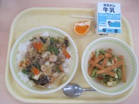 10月28日の給食 公開日 2025/10/29 更新日 2025/10/29 ☆給食☆ ごま塩ごはんいかのかりん揚げ磯香和え呉汁牛乳いかはタウリンというアミノ酸が豊富です。このタウリンは疲労回復に効果があるとされ、栄養ドリンクのCMで「タウリン○○mg配合」など聞いたことがあると思います。いかを食べてシャキッと元気とはならないかもしれませんが、いろいろな食材をバランス良く食べることが元気につながります。かりん揚げは濃いめのたれと揚げた香ばしさで、ごはんとよく合う味です。 給食