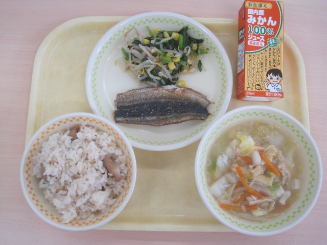 11月11日の給食 公開日 2025/11/11 更新日 2025/11/11 ☆給食☆ 里いもご飯さんまの塩焼き青菜とコーンの和え物白菜と豆腐のすまし汁オレンジジュース今日は秋の食材をたくさん詰め込んだ給食です。近年、さんまが不漁のことが多く庶民の魚と呼べないくらい高額のこともありますが、今年はある程度とれているようです。秋といえばさんまですから、食べて季節を感じてほしいと思います。里芋ご飯もほくほくに炊きあがり、脂ののったサンマとよく合う味でした。 給食