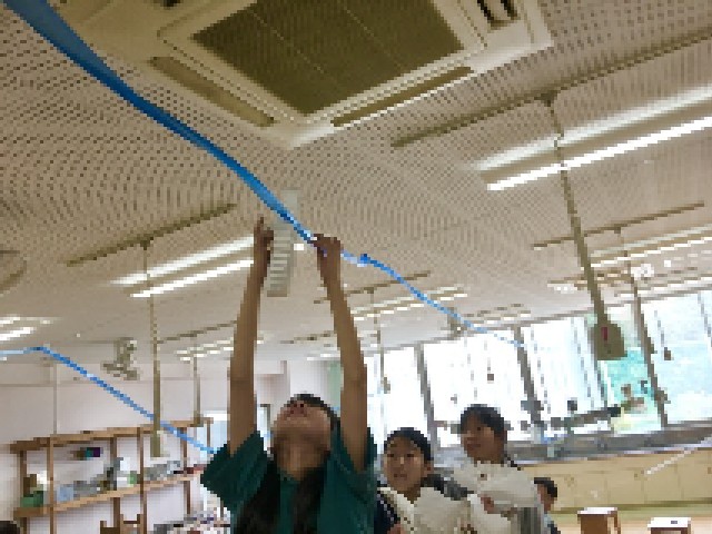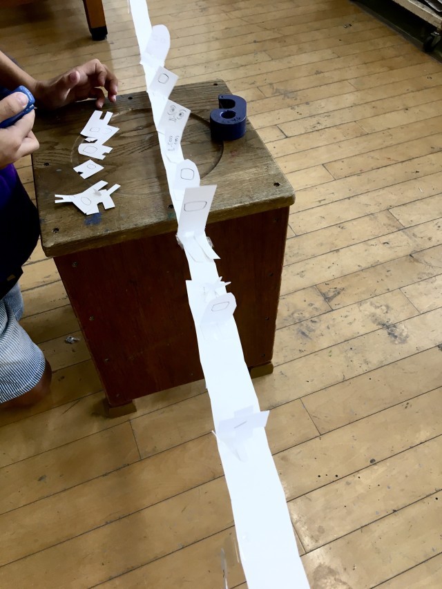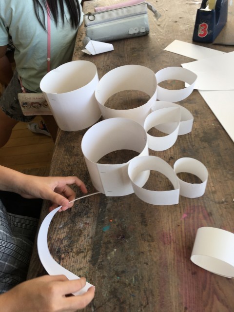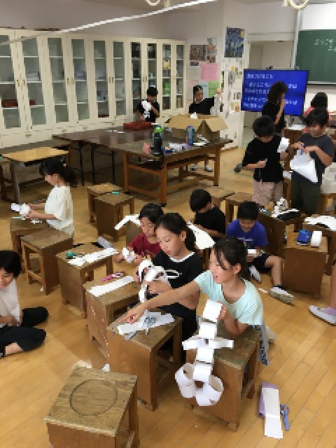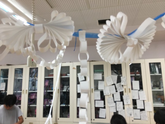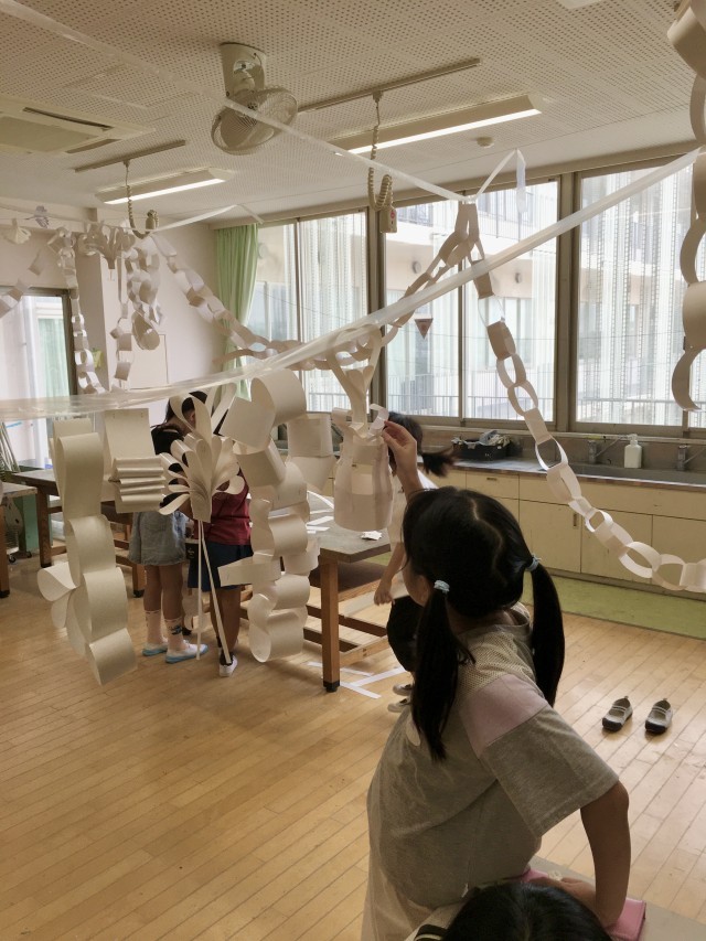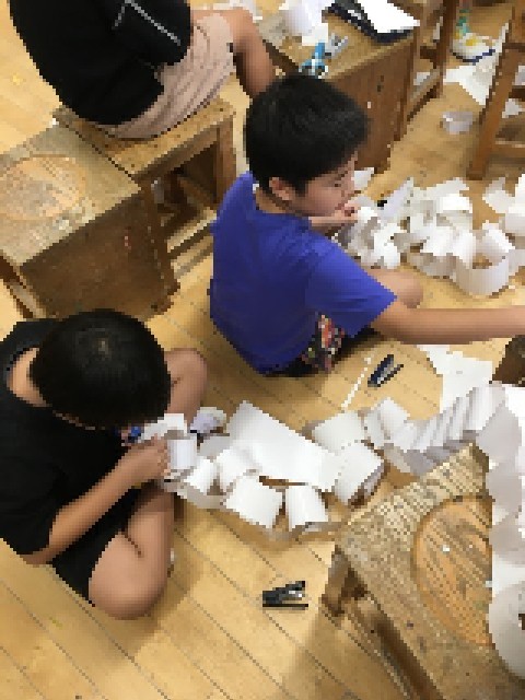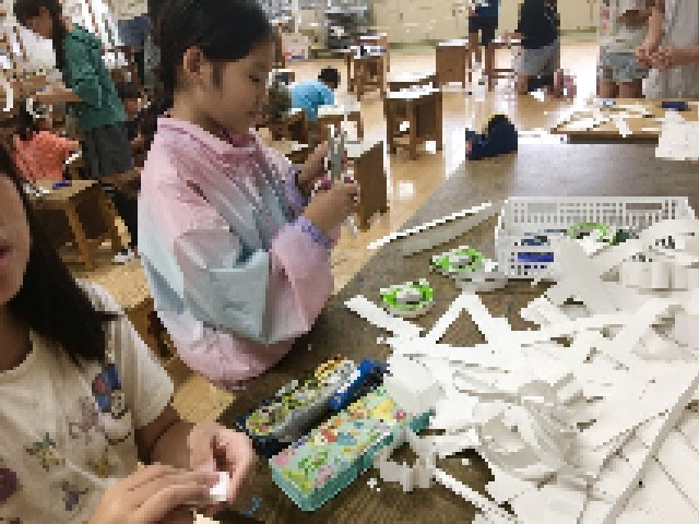 細長い白い紙を、折ったり曲げたりつなげたりして空中都市をテーマに友だちと協力して形にしました。友だちと会話しながら試行錯誤して形ができていました。また、どんどん形をつなげるて大きな作品なった子に、クラスの子どもたちが協力して作品を飾る姿が見られました。授業の終わりにはいつもと違う図工室に大変身しました。