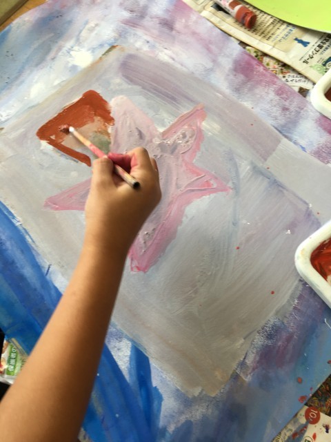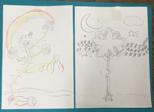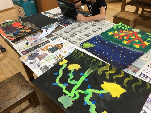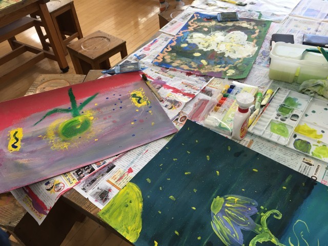 まぼろしの花という言葉からイメージした花を絵に表しました。最初にグループでラウンドスケッチ(スケッチを描き加えていく)をしてアイデアを共有しました。次にまぼろしの花の種を段ボールやペン、コンテパステルなどで作り画用紙にはりました。そして種からのびるまぼろしの花をイメージに合わせて描きました。