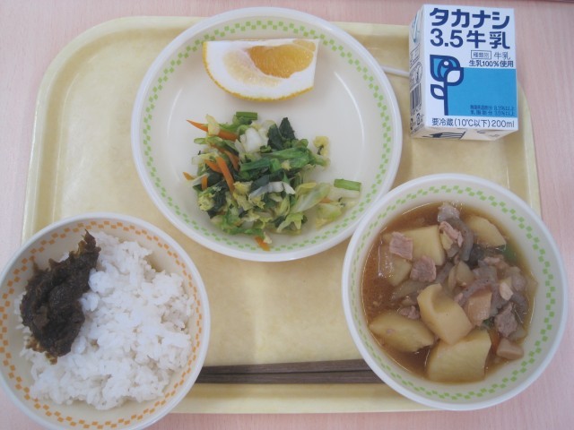 4月17日の給食 公開日 2026/04/17 更新日 2026/04/17 ☆給食☆ ごはん海苔の佃煮おひたし肉じゃが美生柑牛乳今日は肉じゃがです。この季節のじゃがいもは新じゃがなので柔らかくて味が染みやすい特徴があります。今日の肉じゃがも味が良くしみて、ごはんと良く合いました。美生柑は和製グレープルーツといわれる柑橘で、ちょっとだけ苦さも感じます。美味しく感じる子と、苦手に思う子に分かれていたようです。 給食