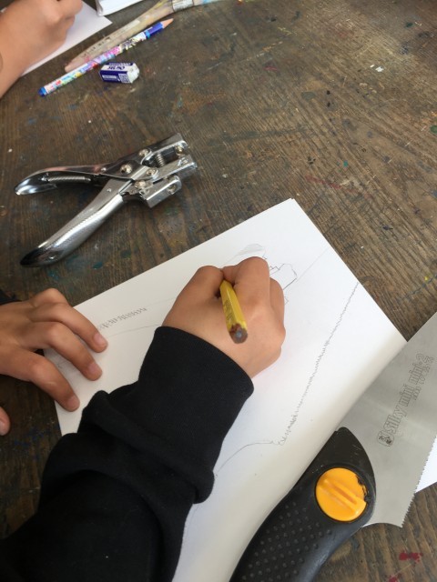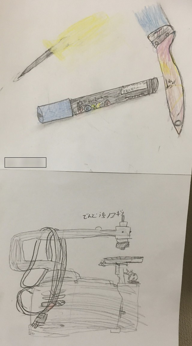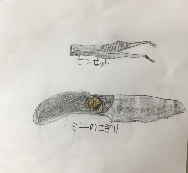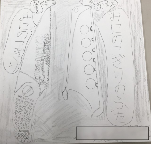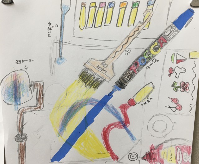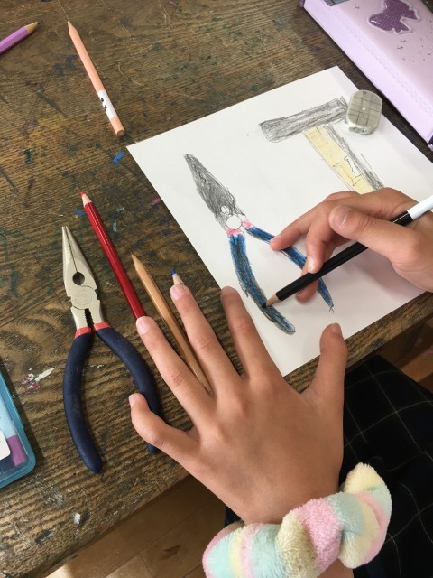後半は、図工室にあるお気に入りの道具を選んで、スケッチに挑戦です。 「この道具、近くで見ると面白い形をしているね」と、特徴をよく観察しながら、どの子も画用紙に向かって真剣に描いていました・