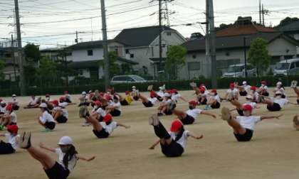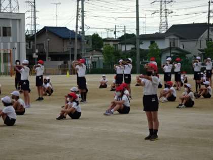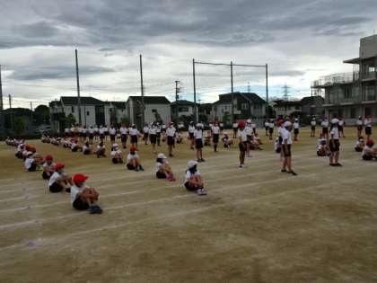 体育館などで技を磨いてきた6年生が、今日初めて校庭に出て練習をしていました。個人技を始める前に演技として、メロディーにのせて準備運動から披露してくれます。これは、普段の授業からやっていることなので、とても自然な姿です。技一つ一つもそうですが、一列にまっすぐ並ぶ様子、体育座り、肩の高さで伸ばすストレッチ、気を付けの姿勢など何気ない姿勢でもさすが6年生、とても美しいです。