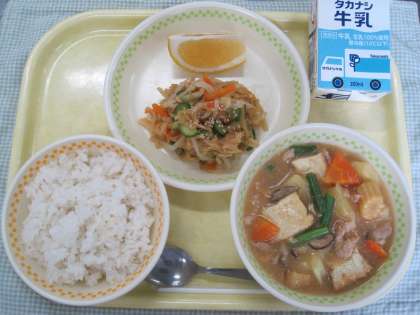 麦ご飯 家常豆腐 切り干し大根のサラダ 美生柑