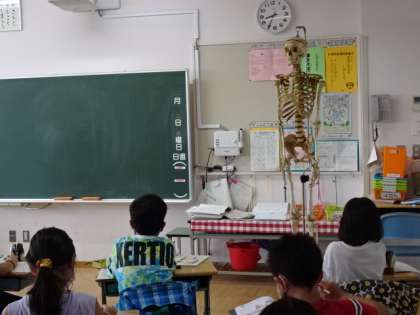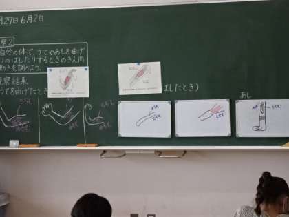 4年生 理科 きん肉のはたらき 公開日 2021/06/02 更新日 2021/06/02 鶴一日記 4年生が人間の体の学習をしていました。教室に人体模型も登場です。模型で骨や関節を確かめてから、今度は自分の腕や足の筋肉を実際に動かしながら観察してみました。 全学年