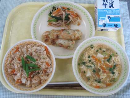 6月3日の給食 公開日 2021/06/03 更新日 2021/06/03 ☆給食☆ そぼろご飯 かき玉汁 ちくわの磯辺揚げ 青菜とえのきのお浸し 学校で作る混ぜご飯は、ご飯と、具を別々に作り、釜で混ぜ合わせて配食しています。ご飯と具を混ぜ合わせた時にちょうどいい味付けになるように工夫しています。 給食