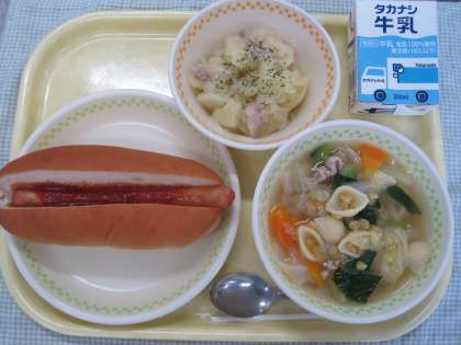 6月4日の給食 公開日 2021/06/04 更新日 2021/06/04 ☆給食☆ ホットドック レンズ豆とキャベツのスープ ジャーマンポテト 今日はオリンピックパラリンピック給食でドイツの料理です。ジャーマンポテトはドイツを代表するじゃが芋料理のひとつです。ドイツは冬に食物が収穫されにくいので、保存がきく食材を使うことが多いようです。 給食