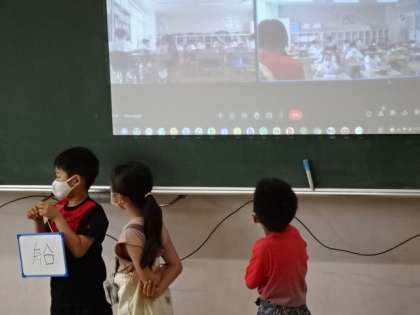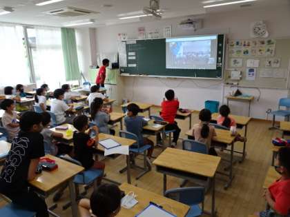 3年生の外国語の学習です。今日は数字の学習とHow many stroke?をを使って、『この漢字は何画?』のクイズを出し合っていました。またイングリッシュルームの3組と教室の4組で同時に授業を行い、双方向で問題を出し合っていました。他のクラスとつながった瞬間、ワクワク度があがり手を振ったりして一緒に学習していることを実感していました。『船』や『曜』など難しい漢字を出したり、英語で『11(Eleven)!』などと答えたりしていました。