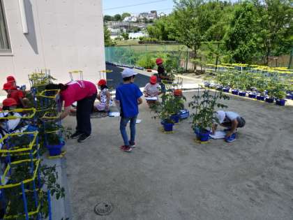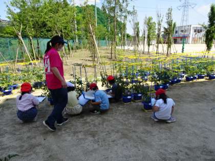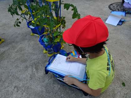 ミニトマトの背丈もだんだん大きくなってきました。2年生が国語の観察文に使うメモを取ったり、生活科の観察カードをかいたりしていました。小指の爪ぐらい小さな実や親指より大きな実がなっていました。『僕のは13個ついている。いつ赤くなるかな?』と話してくれました。『茎を触って、その指をにおいをかいでみてください。』と言われてやってみると、トマトのあおくて強いにおいがしました。 赤くなって収穫して家に持ち帰るのはいつごろでしょうか?