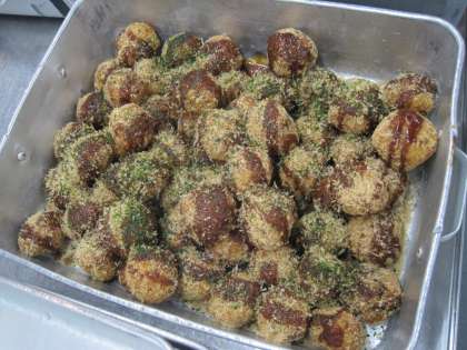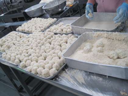 今日は今月の食育の日でまち☆ベジメニューです。今日は町田野菜のじゃが芋とキャベツを使ってたこ焼きコロッケを手作りました。一人2個ずつなので、約1600個のコロッケを丸めて揚げました。とても大変な作業でしたが、調理員さんが効率的に手際よく作業を進め、時間内に仕上がりました。コロッケを揚げたあとで、ソースと青のりとおかかをかけました。見た目も楽しめるメニューです。