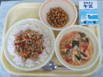 6月29日の給食 公開日 2021/06/29 更新日 2021/06/29 ☆給食☆ ガパオライス 卵とトマトのスープ 青のりビーンズ 今日はオリパラ給食でタイ料理のガパオライスを作りました。ガパオとは、タイでバジルのことを意味します。ガパオライスは、鶏肉・玉ねぎ・にんじん・ピーマン・バジルを炒めたものをご飯にのせていただきます。ガパオライスの味付けには、ナンプラーも使っています。エスニックな味付けを楽しんで食べてほしいです。 給食