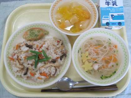 7月7日の給食 公開日 2021/07/07 更新日 2021/07/07 ☆給食☆ ちらし寿司 天の川スープ 笹かまの天ぷら 七夕フルーツポンチ 今日は七夕メニューにしました。星型のかまぼことそうめんが入った天の川スープと、星型の寒天が入ったフルーツポンチです。笹かまの天ぷらは、青のりを入れた衣で揚げて、笹に見立てています。みんなが短冊に書いた願い事がかないますように。 給食