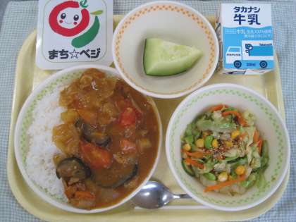 今日は町田野菜を使った「まち☆ベジ」給食です。今日、カレーに使用した町田野菜は、じゃがいも、かぼちゃ、にんじん、玉ねぎ、なす、トマトの6種類です。町田で採れた野菜を町田の私たちが食べることを「地産地消」といいます。地元で採れた野菜は、新鮮で、栄養価も高く、作った人の顔が分かるので安心して食べることが出来ます。また、配送にも時間がかからないので環境にも優しいです。地元の野菜を使うといいことばかりですね。みんなでおいしくいただきましょう。