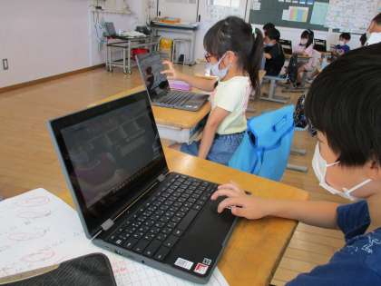 2年生は、国語で学習した物語文「スイミー」の主人公スイミーをプログラミング教材のビスケットを使って動かしていました。