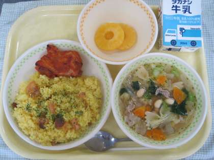 7月14日の給食 公開日 2021/07/14 更新日 2021/07/14 ☆給食☆ イエローライス ペリペリチキン ポットジェコ パインのシロップ漬け 今日は南アフリカ共和国にちなんだ給食です。町田市は、東京オリンピックパラリンピックで南アフリカ共和国のホストタウンになっています。給食では、南アフリカ共和国の料理「ペリペリチキン」と「ポットジェコ」を作りました。 給食