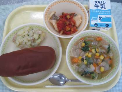 9月9日の給食 公開日 2021/09/10 更新日 2021/09/10 ☆給食☆ ココアパン 白身魚のラビゴットソース ペイザンヌスープ リヨネーズポテト 今日のラビゴットソースとは、フランス発祥のすっぱいソースのことです。ラビゴットソースは、お酢とみじん切りにした野菜が入っていて、魚料理にのせるソースとして使われることが多いです。また、「ラビゴット」とは、フランス語で元気を出させるという意味があります。給食では、揚げた白身魚にラビゴットソースをかけました。 給食