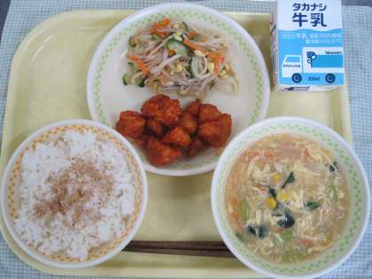 9月14日の給食 公開日 2021/09/14 更新日 2021/09/14 ☆給食☆ ごまご飯 ヤンニョムチキン 中華風コーンスープ 豆もやしのナムル 今日は韓国の料理「ヤンニョムチキン」を作りました。ヤンニョムとは、テンメンジャン、コチュジャン、唐辛子、ごま油、砂糖などいくつかの材料を組み合わせて作る合わせ調味料です。韓国では、炒め物や鍋料理など様々なものに使われています。給食では、じゃが芋と鶏肉を揚げたものにヤンニョムを混ぜました。見た目は辛そうですが、甘辛くおいしい味付けです。 給食
