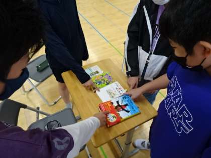 図書指導の実証授業として、6年生のミニビブリオバトルの学習が行われました。『本を通して人を知る、人を通して本を知る』という意識をもち、各グループに分かれて自分のおすすめの本を紹介していきます。あらすじやおもしろいと思ったところを話したり、グループの友達に問いかけたり、表紙やさし絵を見せたりしながら本の魅力を伝えます。質問タイムを経て最後に良かったと思う本をせーので指差します。各グループのチャンプ本が決まったら、次回は各グループの代表がチャンプ本でクラスに対してビブリオバトルを行うそうです。