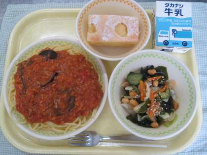 9月17日の給食 公開日 2021/09/17 更新日 2021/09/17 ☆給食☆ 町田産なすのトマトスパゲティ まめまめサラダ りんごろケーキ 今日19日で食育の日です。今月は、町田産のなすを使いました。町田市は、なすの収穫量が都内で2番目に多いそうです。畑から収穫してすぐの新鮮ななすは、へたのとげがするどく、さわると痛いくらいです。なすが少し苦手な人も、収穫したてのおいしいなすを食べたら、なすが好きになるかもしれません。また、りんごろけーきは、給食室で手作りしました。 給食