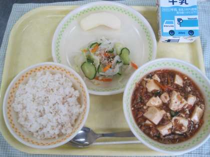 9月22日の給食 公開日 2021/09/22 更新日 2021/09/22 ☆給食☆ 麦ご飯 麻婆豆腐 野菜の甘酢和え りんご 今日は麦ご飯です。麦は雑穀のひとつで、ビタミンB1や食物繊維が多く含まれています。給食では、栄養たっぷりの麦を月に何度か白米に混ぜて出しています。 給食