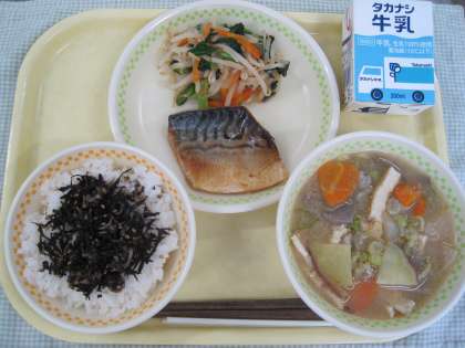 ご飯(ひじきふりかけ) 鯖のカレー焼き さつま芋の味噌汁 野菜のからし和え