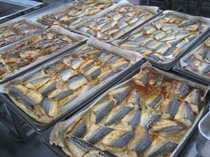 今日は、旬の食材「鯖」と「さつま芋」を使った和食の献立です。鯖は、カレー粉と甘辛いしょうゆのたれに漬け込んで焼きました。さつま芋の入った味噌汁は、さつま芋の甘みでまろやかに仕上がりました。旬を味わいながら食べてほしいです。