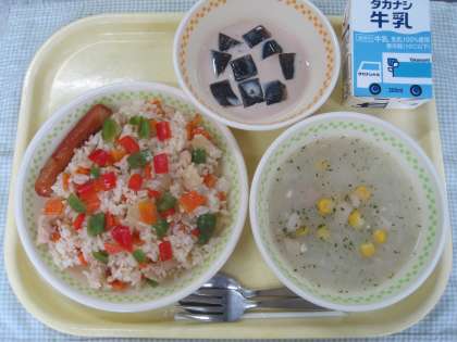 今日はコロンビアの料理を作りました。アロス・コン・ポーヨは、お米と鶏肉を使った料理です。アヒアコは、じゃが芋と鶏肉のとろみのあるスープです。コロンビアでは、肉を使った料理がよく食べられているようです。また、コロンビアはコーヒーも多く作られ、飲まれているので、給食ではコーヒーゼリーをデザートとして出しました。給食のコーヒーゼリーは、ダイス型にカットしたコーヒーゼリーと町田産の牛乳で作ったミルクシロップを合わせています。