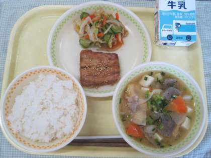 今日はさんまを蒲焼きにしました。蒲焼きとは、魚を開いて、骨をとって、焼いたものにたれをぬったものをいい、江戸時代から始まっている調理法だそうです。給食では、さんまを油で揚げて甘辛いたれをからめて作りました。