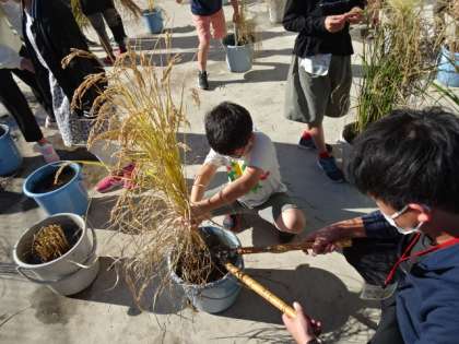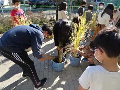 豊かに実った稲を5年生が刈り取っていました。刈り取った稲の束は、協力して麻ひもで結んでいます。