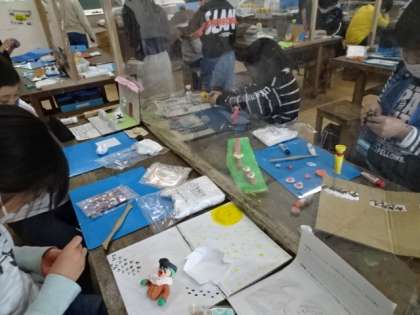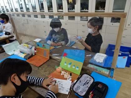 4年生 図工 公開日 2021/11/14 更新日 2021/11/14 鶴一日記 先週まで読書週間だったことから、4年生は図工で好きな本のおすすめの場面を立体化して表現する学習をしています。インタビューしてみると、みんなそれぞれ思いがあることがわかりました。ダンボールの舞台に背景を絵で描き、紙粘土で主人公などを表現しています。 全学年