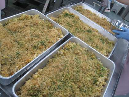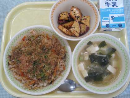 今日は兵庫県のB級グルメで有名な「そばめし」を作りました。そばめしは、焼きそばとご飯を炒めて、ソースで味付けした料理です。関西では、お好み焼きと同じようによく食べられている料理のひとつです。給食では、細かく切った麺で焼きそばを作り、ソース味に炊いたご飯と合わせました。